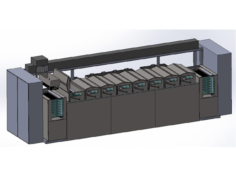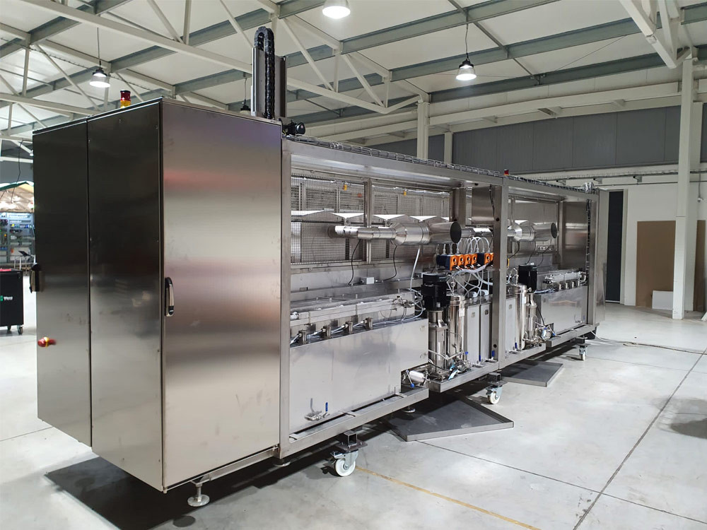 Plně automatické zařízení pro formování anod tantalových kondenzátorů (vstupní a výstupní dopravník, automatický zakladač, 8 formovacích van (boxů) na formování kondenzátorů.