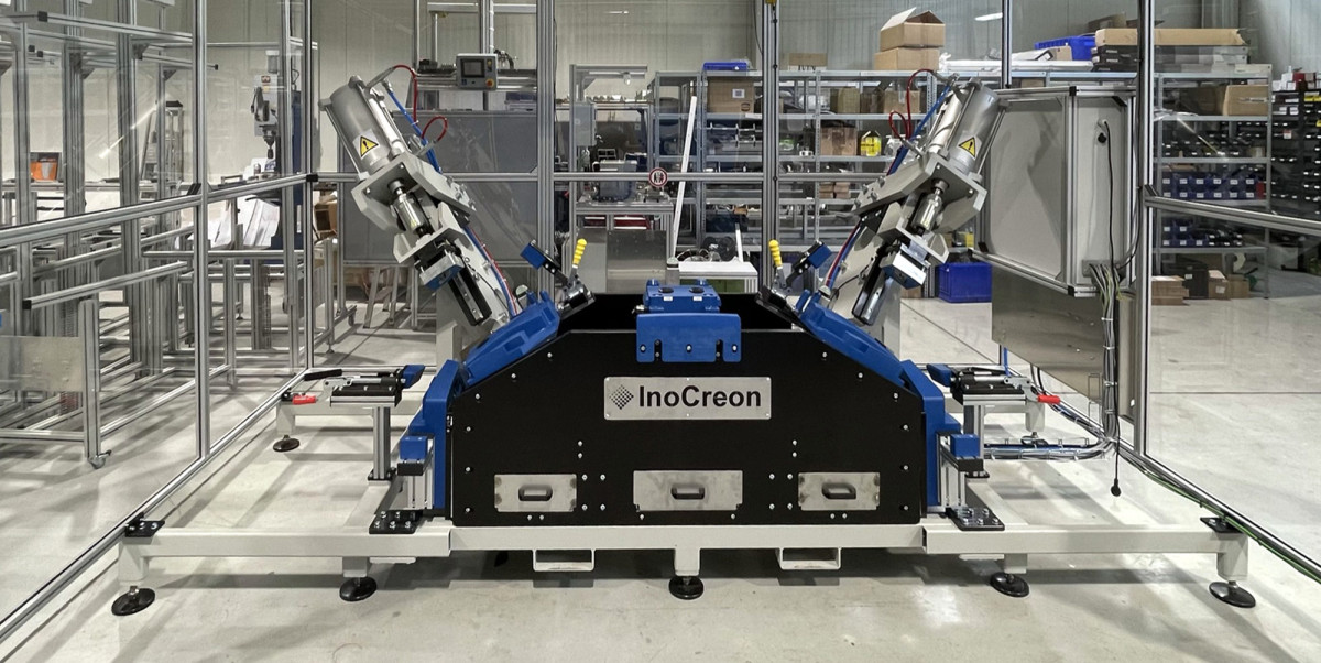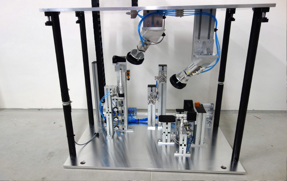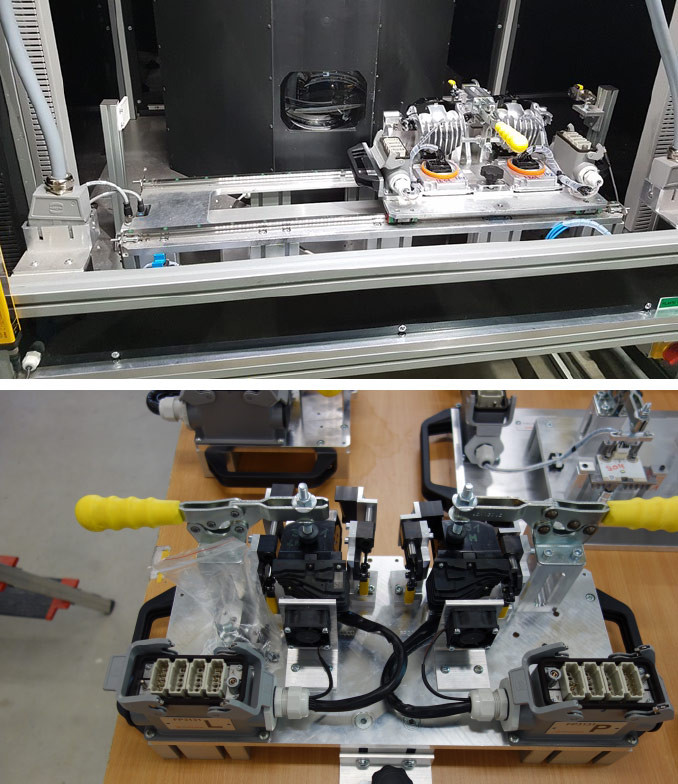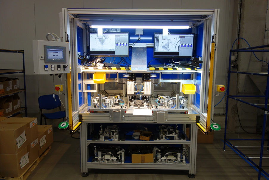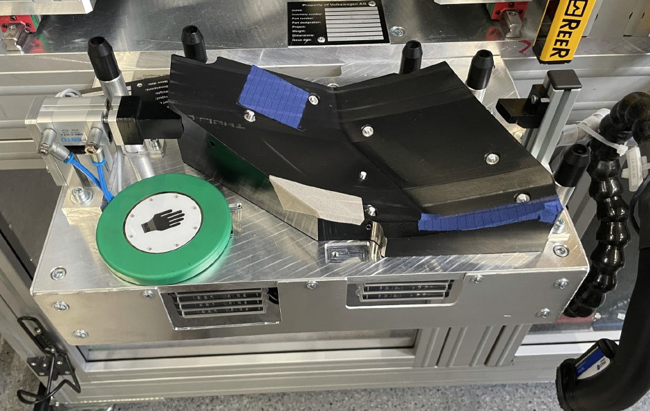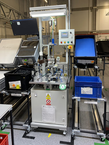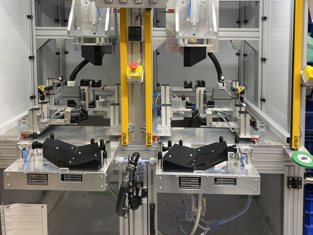Montážní stanice s robotem na osazování klipů do různých dílů na Porsche Taycan (robot, vibrační dopravník, kamerová kontrola přítomnosti osazených dílů, vyměnitelné přípravky)