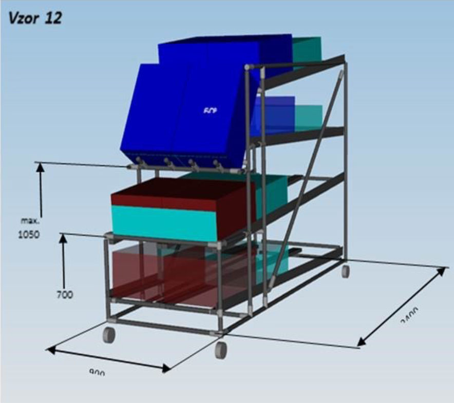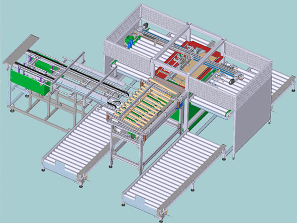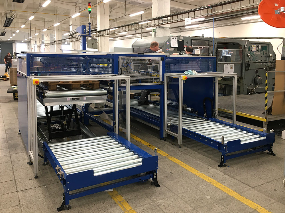 Dopravníkový systém s paletizací a výsekovým nástrojem dle zvoleného motivu do strojní lepenky a odkládání na palety