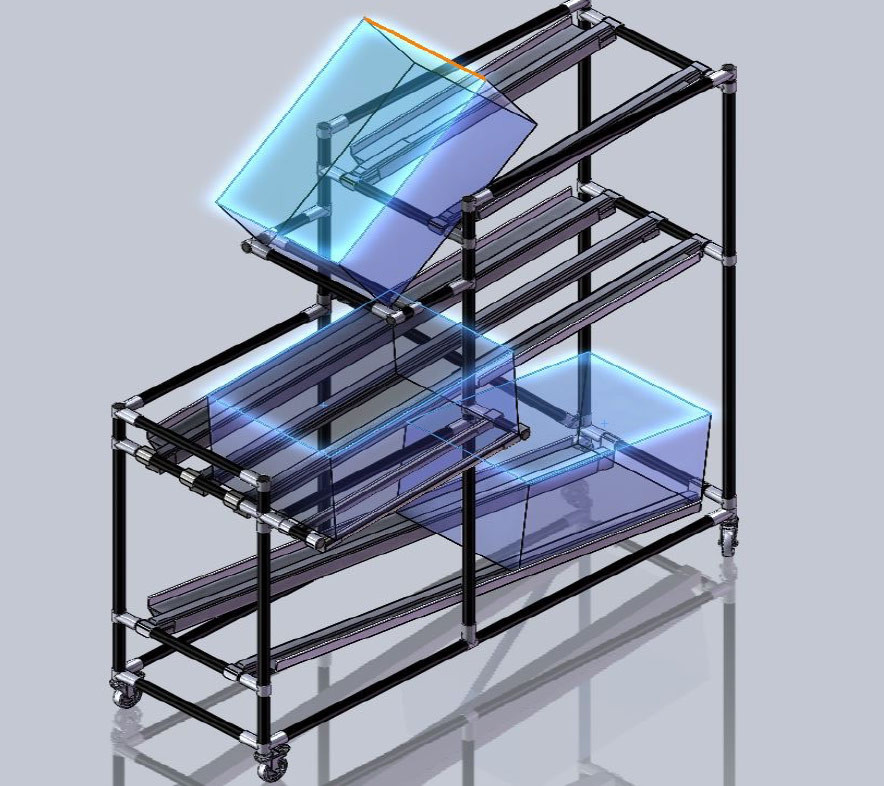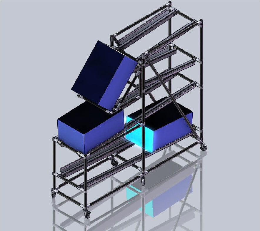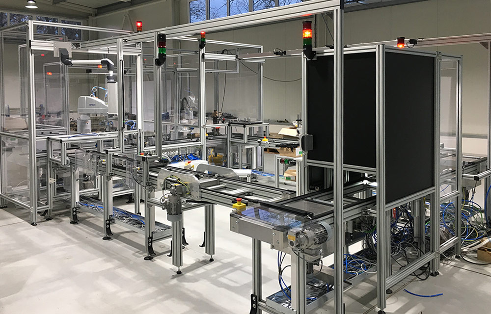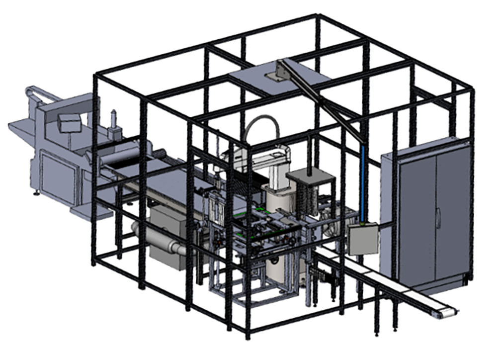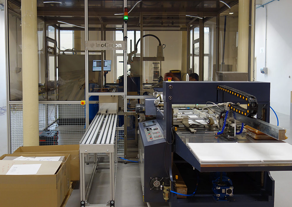 Kašírovací stanice na potisk reklamních boxů – nanášení polepu s motivem na boxy ze strojní lepenky, robot naváděný pomocí kamery, která mu dává souřadnice polepu na dopravníku od stanice s nanášením lepidla, transport do zavinovací stanice a následně na výstupní dopravník