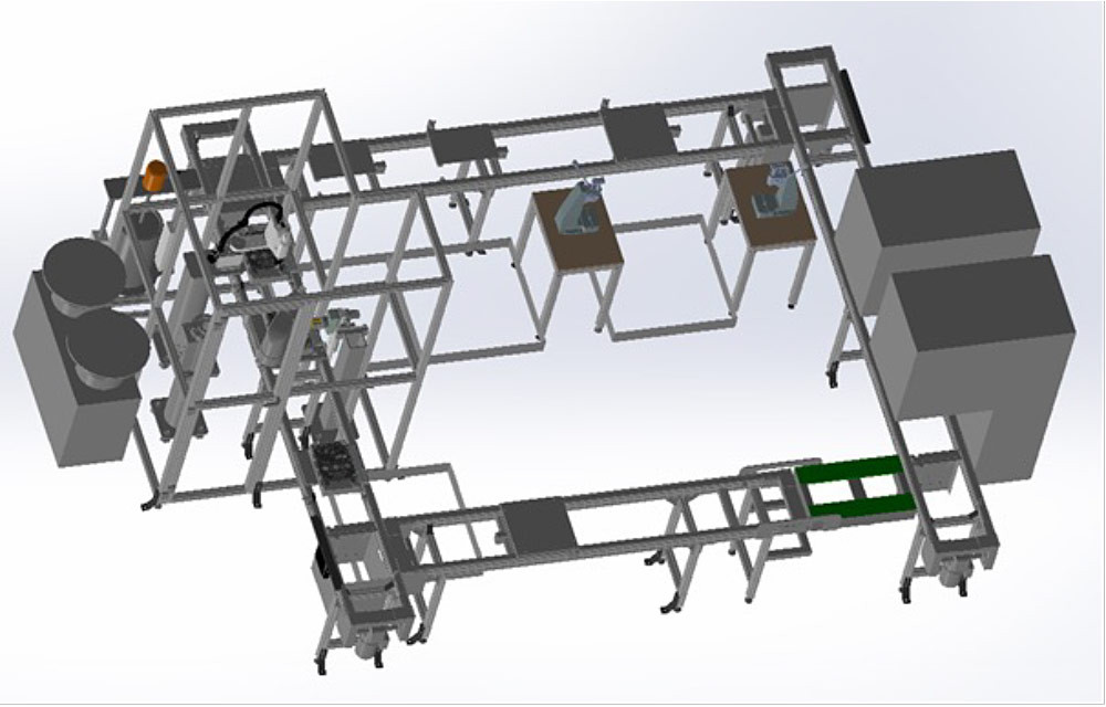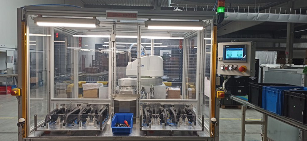 Montážní stanice s robotem na osazování klipů a distančních vložek do madel pro VW Golf VIII (robot, 2x vibrační dopravník)