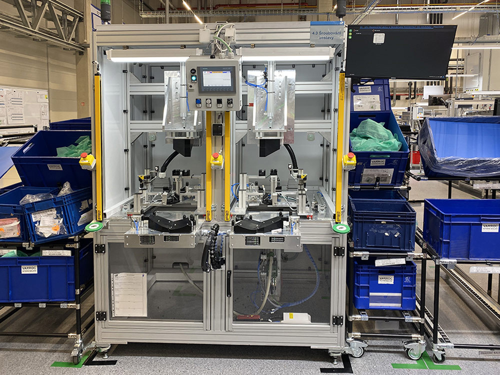 Montážní zařízení pro automatické šroubování zadní skupinové lampy pro VW Tiguan facelift (použité šroubováky DEPRAG s automatickým podavačem šroubů pohyblivých ve třech osách)